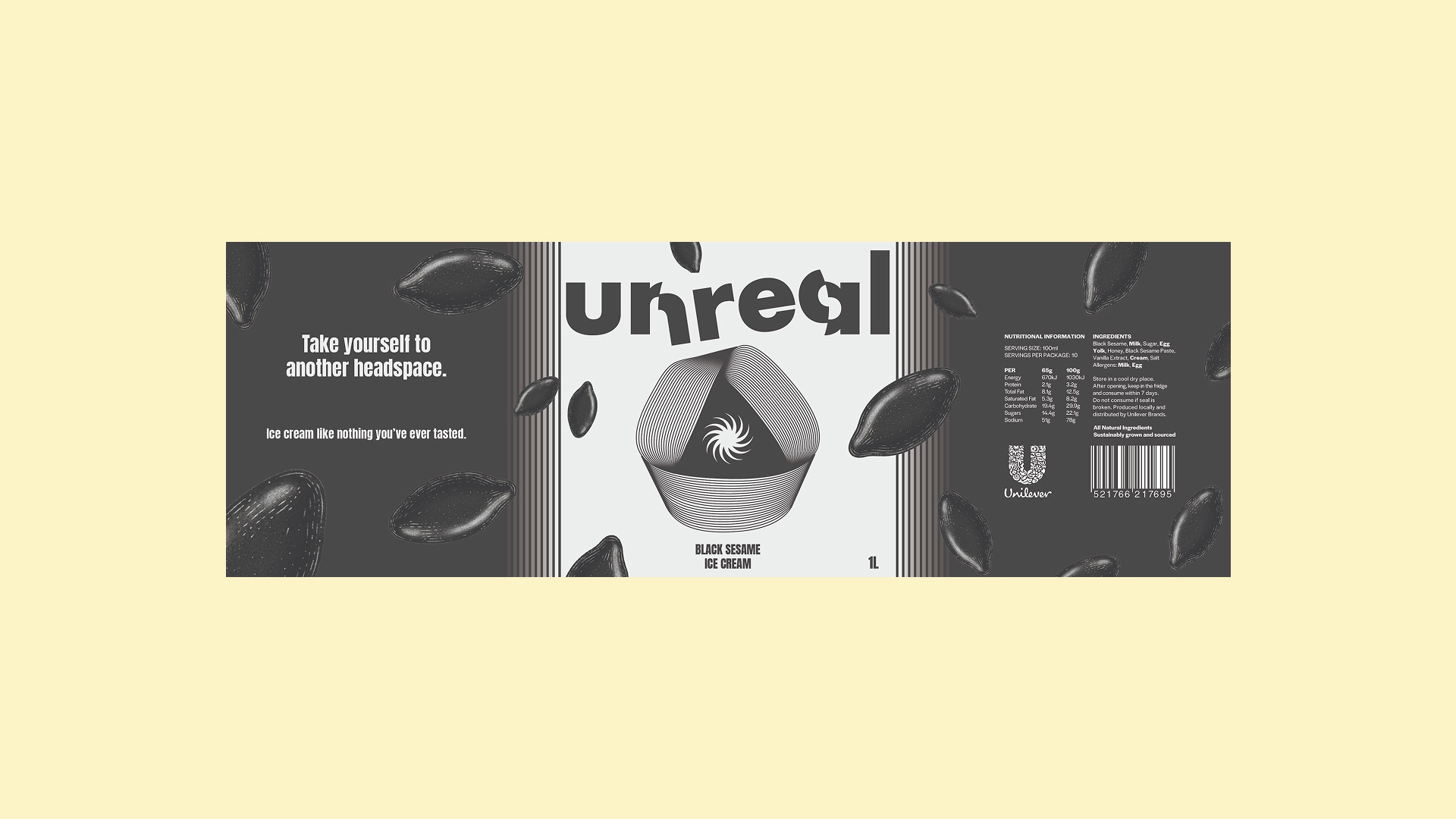 unreal is an ice cream brand that differentiates itself with its intense, exotic flavours. Its packaging evokes that intensity wherever it appears by drawing inspiration from classic Sci-Fi novel covers, 60’s Op Art and ice cream swirls.